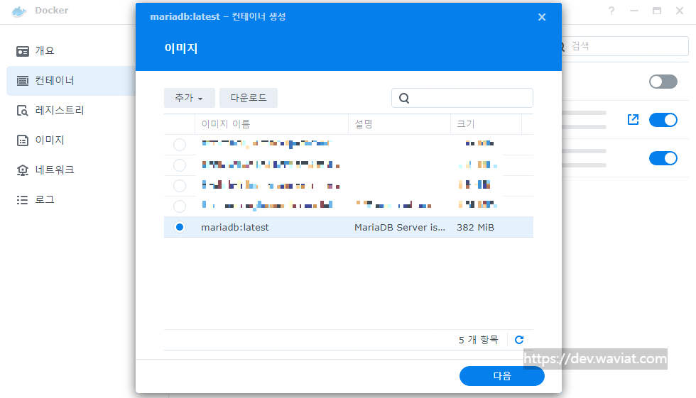우선 레지스트리에서 mariadb검색하고 최근버전으로 이미지를 다운로드 한다.